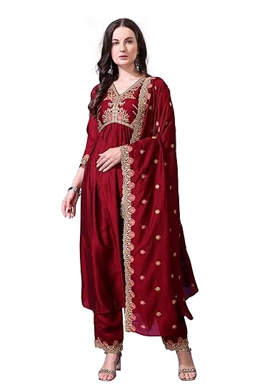 Discover the perfect fit with our Anarkali style! Made from luxurious silk, this ensemble features a stunning red kurta, matching palazzos, and a beautiful dupatta, all crafted from the same high-quality silk. Embrace elegance and comfort in this vibrant outfit!
