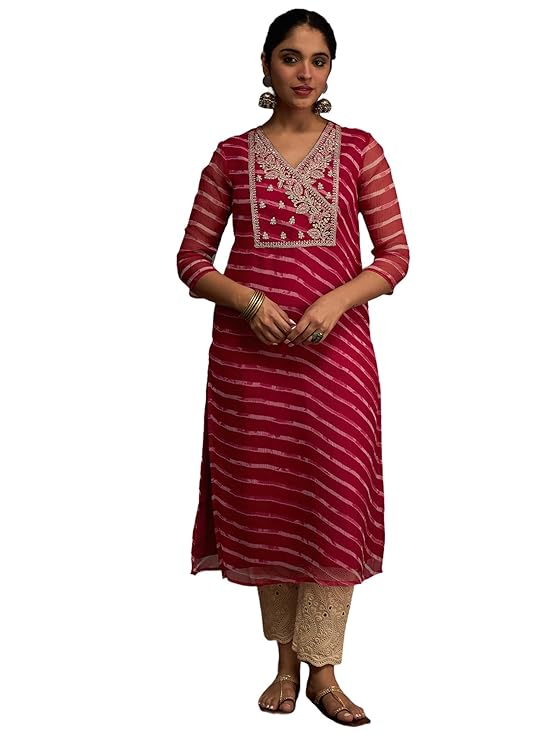 Elevate your wardrobe with INDO ERA Women Georgette Leheriya Printed Straight Kurtas. Stylish, comfortable, and perfect for every occasion. Shop now!