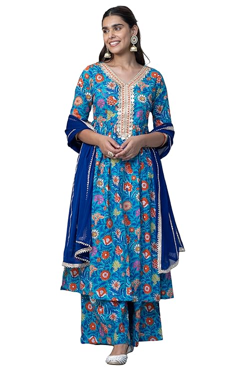 Discover elegance with Janasya’s Women’s Cotton Ethnic Kurta, featuring intricate embellishments, a flared palazzo, and a stylish dupatta for a complete look.
